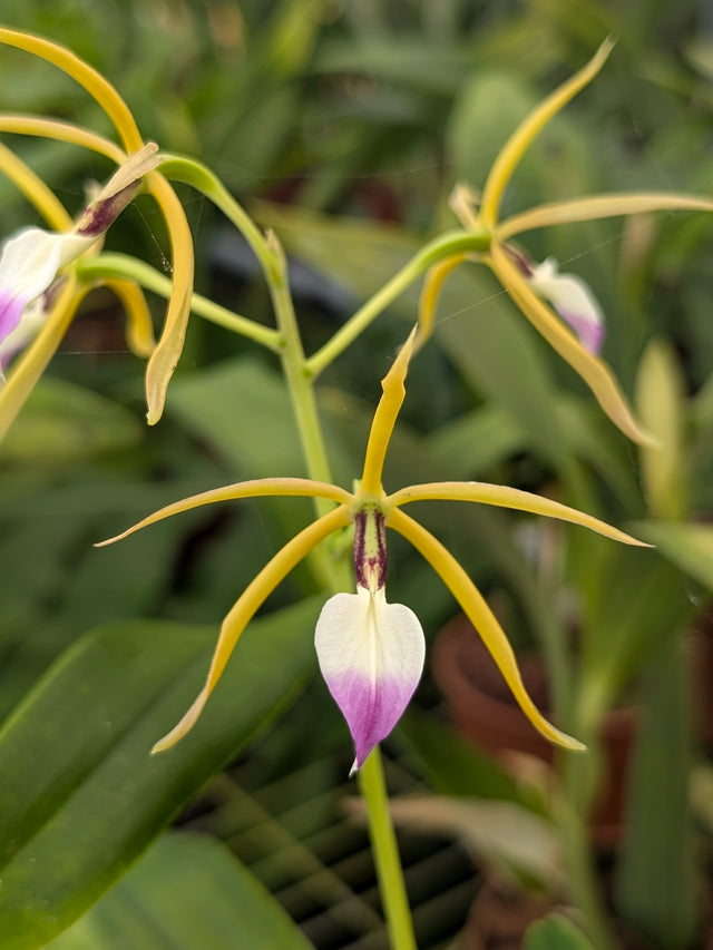 Floraison été/automne, sur une tige érigée qui apparaît au sommet du pseudobulbe, fleurs jaune vert au labelle blanc et rose.