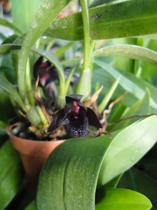 Floraison possible tout au long de l'année. Tige courte érigée depuis la base des pseudobulbes portant une fleur unique, rouge très foncé, presque noire.